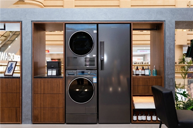 衣物护理空间是南通店的另一大亮点。在这里,洗衣房不再是传统的功能角落,而是一个融合美学与实用性的生态系统。洗衣机、干衣机、衣物护理柜等产品,与苔原灰色石材、榆木、烟灰色玻璃等材质搭配,与家居空间自然融为一体,让洗衣区也成为家中值得驻足的地方。