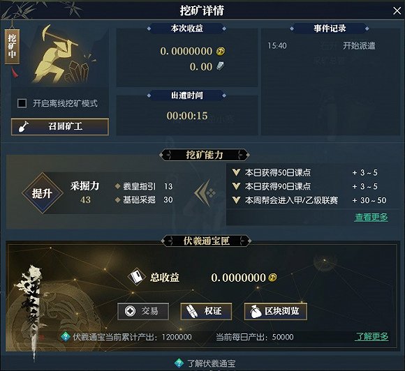 当然,玩家每天获得伏羲通宝的数量会和自身采掘能力和采掘时长相关,但这并不会消耗他们电脑的性能。玩家可以通过游戏中的事件和活动提升采掘能力。
