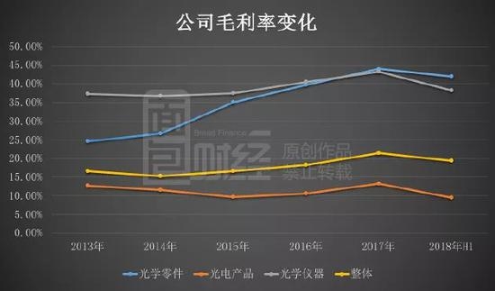 财报显示,公司毛利率约19.4%,较去年同期下降约1.2个百分点。其中,光学零件、光电产品及光学仪器毛利率分别为42%、9.4%及38.3%,三大业务毛利率较去年同期均出现下滑。
