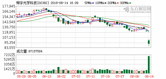 14日开盘后,舜宇股价大幅低开,当日跌幅达到24.11%,市值蒸发超过300亿港币。直接上截图: