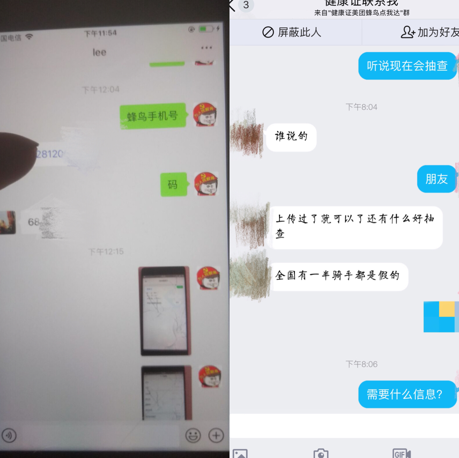 蜂鸟一名“众包骑手”称,由于平台审查不严,身边大部分骑手用的都是假健康证,价格在30元左右。“假证只能用在‘众包’审核时,不用面试,通过平台上传证件就可以。我用的就是假证。” 这名骑手告诉记者,他用假健康证进行注册,顺利通过了平台审核。该骑手打开众包APP,进行刷脸后登陆了软件。很快,软件上就显示“有新订单”。