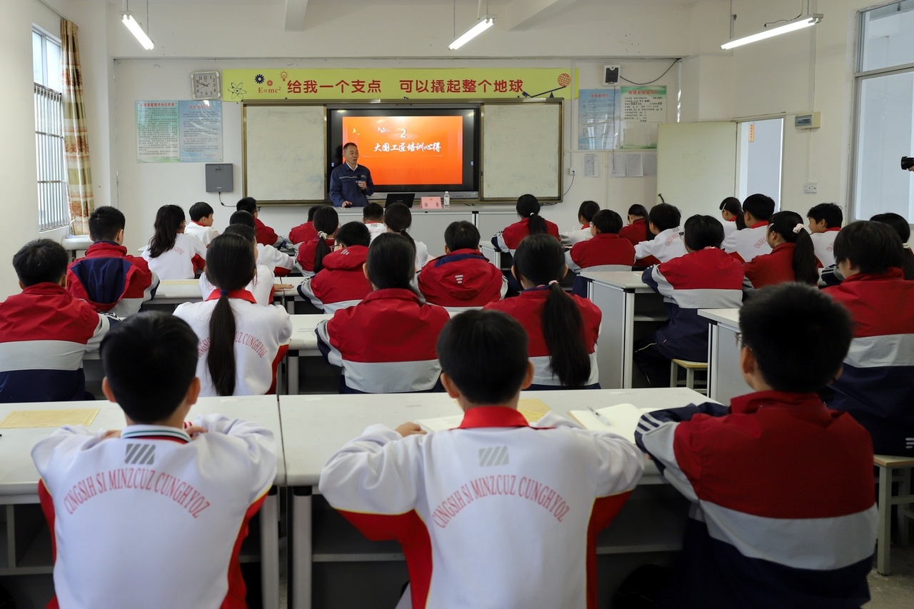 在靖西市民族中学同步举办的“劳模工匠进校园”活动中,大国工匠唐勇结合自身成长经历,生动讲述“从普通技工到大国工匠”的奋斗历程,激励青少年学生树立技能报国之志,并大力弘扬劳模精神、劳动精神、工匠精神。此外,参加志愿服务活动的全体人员还到产业园区和企业走访参观。