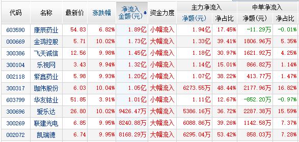 金融界网站资金流向显示:低价股活跃明显,其中金鸿控股(行情000669,诊股)资金净流入1.73亿,乐视网资金净流入1.32亿,联建光电(行情300269,诊股)资金净流入8240万,凯瑞德(行情002072,诊股)资金净流入8169万;珈伟股份(行情300317,诊股)为光伏概念资金净流入1.05亿;爱乐达(行情300696,诊股)为军工股资金净流入946万。飞天诚信(行情300386,诊股)为5G概念资金净流入1.45亿,康辰药业(行情603590,诊股)为开板次新股资金净流入1.89亿。