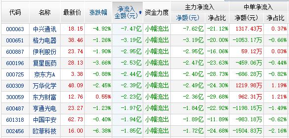 金融界网站资金流向显示:不飞白马股继续回落,其中中兴通讯(行情000063,诊股)资金净流出7.47亿,格力电器(行情000651,诊股)资金净流出3.19亿,伊利股份(行情600887,诊股)资金净流出2.95亿,复星医药(行情600196,诊股)资金净流出2.53亿,京东方A(行情000725,诊股)资金净流出2.44亿,万华化学(行情600309,诊股)资金净流出2.39亿,中国平安(行情601318,诊股)资金净流出1.94亿。