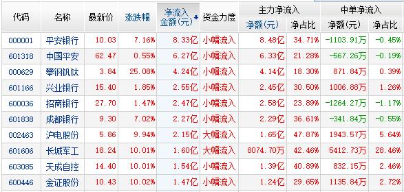 金融界网站资金流向显示:金融股大幅上涨,其中平安银行(行情000001,诊股)资金净流入8.33亿,中国平安(行情601318,诊股)资金净流入6.27亿,兴业银行(行情601166,诊股)资金净流入2.55亿,招商银行(行情600036,诊股)资金净流入2.47亿,成都银行(行情601838,诊股)资金净流入2.27亿;攀钢钒钛重新上市资金净流入4.24亿;沪电股份(行情002463,诊股)资为业绩预增资金净流入2.15亿,天成自控(行情603085,诊股)为高送转概念资金净流入1.54亿,金证股份(行情600446,诊股)为业绩股资金净流入1.47亿。