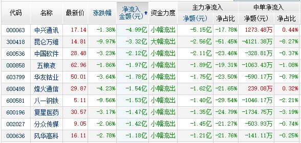 金融界网站资金流向显示:科技股回落,其中中兴通讯(行情000063,诊股)资金净流出4.99亿,中国软件(行情600536,诊股)资金净流出2.12亿,烽火通信(行情600498,诊股)资金净流出1.54亿,风华高科(行情000636,诊股)资金净流出1.18亿;部分白马股回落,其中五粮液(行情000858,诊股)资金净流出1.97亿,华友钴业(行情603799,诊股)资金净流出1.78亿,复星医药(行情600196,诊股)资金净流出1.47亿;业绩下滑股回落,其中昆仑万维(行情300418,诊股)资金净流出3.32亿,八一钢铁(行情600581,诊股)资金净流出1.53亿。