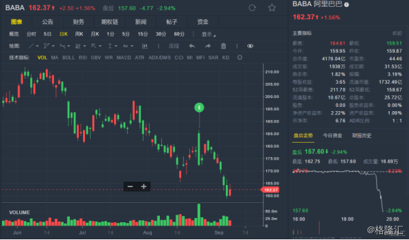 据消息,马云表示,计划下周一(9月10日)辞去阿里巴巴董事长职务,但仍将在阿里巴巴董事会担职,并继续指导公司的管理。马云此前在接受采访时表示,他正把更多的时间和财富用于慈善事业,创立一家以他本人名字命名的基金会,专注教育。阿里巴巴(BABA)盘后迅速下跌近3%,报157.6美元。