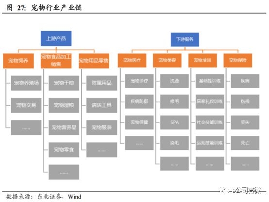 伴随着一只宠物的完整生命周期,宠物行业内形成了一条完整的产业链,包括繁育、训练、食品、医疗、美容、保健、保险等一系列产品与服务。产业链可以分为上游的宠物饲养、宠物食品及用品,下游的宠物医疗、宠物美容、宠物培训、宠物保险等服务。