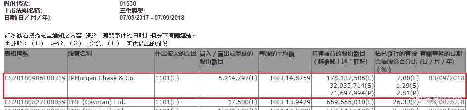 智通财经APP获悉,根据联交所资料显示,摩根大通于9月3日增持三生制药(01530)521万股,每股作价14.8259元,总值7731万元,最新持股量增至7%。