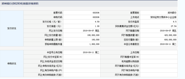 郑州银行今日申购,公司拟在A股发行不超过6亿股普通股,网上发行为1.8亿股,发行市盈率6.5倍,申购代码为:002936,申购价格:4.59元,单一帐户申购上限18万股,申购数量500股整数倍。
