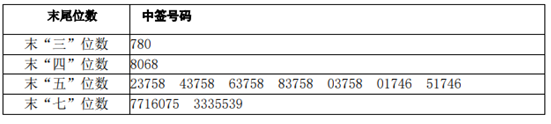 主承销商根据深圳证券交易所提供的数据,对本次网上发行的申购情况进行了统计,本次网上发行有效申购户数为11,179,374户,有效申购股数为81,919,652,500股,配号总数为163,839,305个,回拨后,网下最终发行数量为416万股,占本次发行总量的10%;网上最终发行数量为3,744万股,占本次发行总量的90%。回拨后本次网上发行的有效申购倍数为2,188.02491倍,中签率为0.0457033189%。