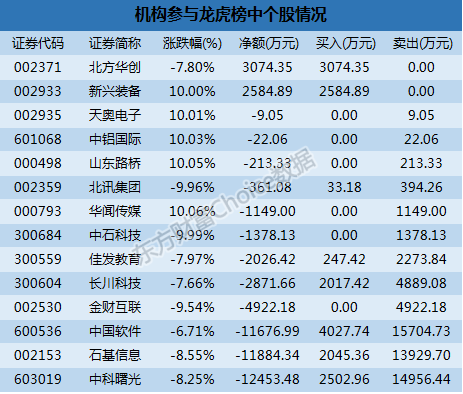 当天,机构参与龙虎榜中个股共涉及14只个股,其中仅北方华创和新兴装备被机构净买入,买入金额分别是3074.35万元和2584.89万元。另外12只被机构净卖出,中科曙光被卖出最多,为12453.48万元。