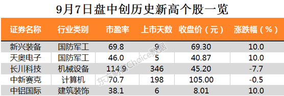 9月7日,沪指全天冲高回落,收报2702.30,涨0.40%。东方财富Choice数据显示,今日有5只个股盘中股价创历史新高,剔除新股、次新股后,剩余2只个股分别为长川科技和中新赛克。