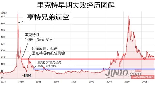 里克特的第一次大败是在上世纪80年代初的白银投资上,当时他才刚开始进行投资。据里克特回忆,他当时做了很多“正确的事情”:对市场进行研究,并在白银从峰值下跌70%时买入实物白银。跟所有投资小白一样,他不知道银价在1980年左右,已经遭到亨特兄弟逼空,当时最高超过45美元/盎司。