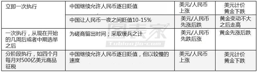 最差的情况是关税立即一次执行,这可能促使中国做出最负面的反应。如果中国选择继续让人民币逐日贬值,那么黄金将续创新低。