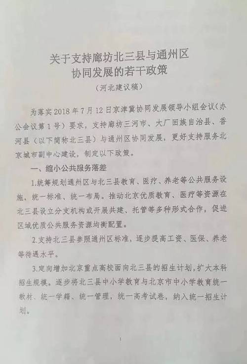 6天前的8月31日,微信朋友圈广为流传一份《关于支持廊坊北三县与通州区协同发展的若干政策(河北建议稿)》(简称“建议稿”)。